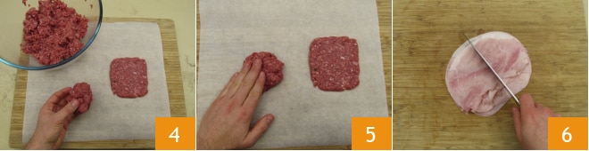 Retire cerca de 80 g de massa e coloque em uma superfície forrada com papel manteiga. Pressione com a ponta dos dedos 4 até obter um quadrado de cerca de 9-10 cm de cada lado 5. Divida as fatias de presunto cozido ao meio 6.