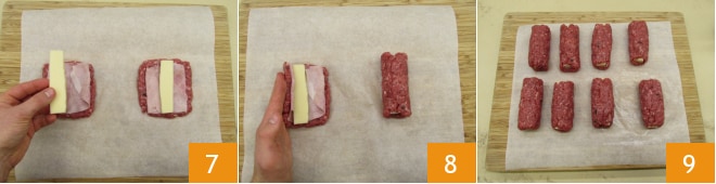 Depois, corte o queijo em tiras de 2 cm e posicione-o no meio de cada quadrado junto com o presunto 7, enrole bem fechando como um cannolo 8 sem selar as duas extremidades. Forme 8 cannoli no total 9.