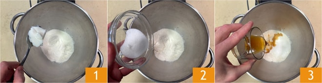 Para preparar o cannolo mil-folhas, comece pela preparação da massa: em uma batedeira, coloque a farinha, a banha 1, o açúcar 2 e o marsala seco 3.