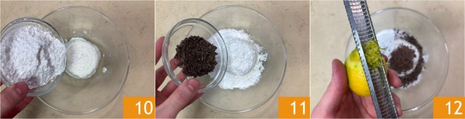 Enquanto isso, prepare o recheio: em uma tigela, coloque a ricota e adicione o açúcar de confeiteiro 10, as lascas de chocolate meio amargo 11 e as raspas de limão 12.