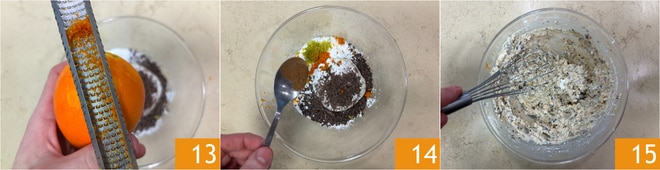 Adicione também as raspas de laranja 13, a canela 14 e misture bem 15 até incorporar todos os ingredientes. Transfira para um saco de confeitar sem bico e reserve.
