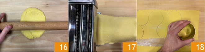 Retome a massa e estenda-a primeiro com um rolo 16 e depois com uma máquina de abrir massa 17, começando pela espessura maior até chegar à menor. A folha deve ter uma espessura de cerca de 2 mm. Coloque-a na bancada de trabalho levemente enfarinhada e corte-a ao meio para trabalhar mais confortavelmente, depois corte discos com um cortador de 9 cm de diâmetro 18. A massa restante pode ser sovada novamente; sempre deixe descansar por 30 minutos na geladeira antes de abrir novamente e criar outros discos. Com essas quantidades, você deve obter cerca de 20 discos.