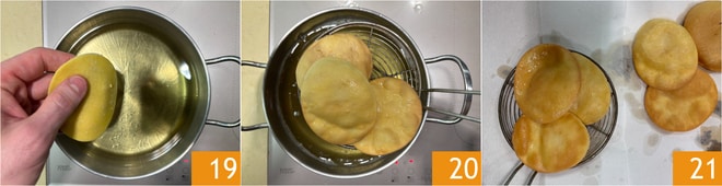 Aqueça o óleo de sementes a uma temperatura de 160°-170°, depois mergulhe 2-3 discos de cada vez 19. Após alguns minutos, começarão a dourar de um lado, então vire-os para o outro lado e frite por mais 2 minutos. Escorra 20 e transfira para papel absorvente para eliminar o excesso de óleo 21.