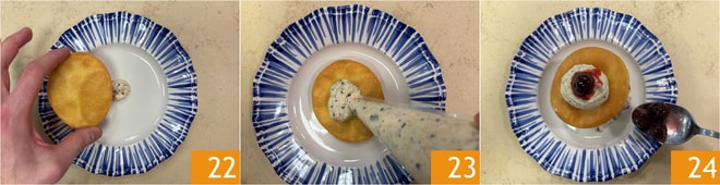 Você está pronto para empratar: no centro do prato, coloque uma pontinha de creme e depois coloque uma casquinha por cima 22. Recheie a casquinha com o creme 23 e continue assim até um total de 3 casquinhas. Adicione uma pitada de creme também na superfície e decore com as cerejas em calda 24.