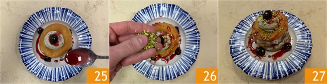 Regue com a calda das cerejas 25 e complete com a granola de pistache 26. Siga esse procedimento para fazer também as outras 5 torres. Seu cannolo mil-folhas está pronto para ser servido 27!