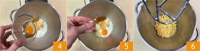 Adicione um ovo 4, uma pitada de sal 5 e ligue a máquina, equipada com gancho em forma de folha, até obter uma massa com consistência granulosa 6.