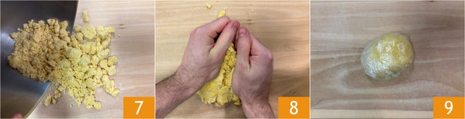 Transfira para a bancada de trabalho 7 e sove com as mãos 8 até obter uma massa lisa e homogênea. Cubra com película plástica 9 e deixe descansar na geladeira por 30 minutos.