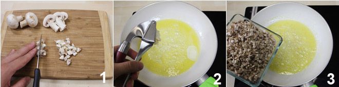 Para preparar as vieiras ao vinho, comece lavando e secando muito bem os cogumelos. Corte-os finamente 1 e doure-os em uma frigideira na qual você terá derretido a manteiga, um fio de azeite de oliva extravirgem e o alho esmagado (2-3).
