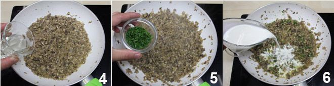 Flambe com o vinho branco 4, adicione uma pitada de salsa 5 e junte o creme de leite 6, deixe cozinhar até que atinja uma consistência cremosa.