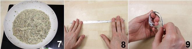 O recheio das vieiras ao vinho não deve ficar muito seco 7. Ajuste o sal e a pimenta, se necessário. Pegue agora uma assadeira e cubra-a com papel manteiga. Com tiras de papel alumínio, forme círculos (8-9) que, colocados na base de cada concha, servirão de suporte para as vieiras ao vinho.