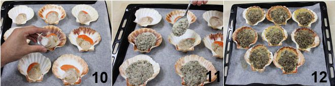 Coloque as vieiras sobre seus suportes, salgue e apimente levemente para que fiquem saborosas 10, prossiga colocando sobre as vieiras o recheio previamente preparado 11 e asse a 200°C por 20 minutos em forno estático. Nos últimos 5 minutos, ligue o grill para obter uma bela gratinação. O tapa vieiras ao vinho está pronto para ser saboreado!