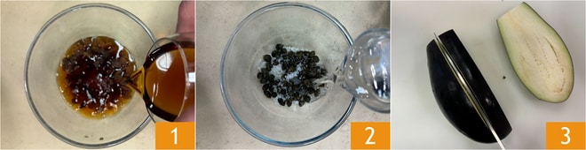 Para preparar a caponata de berinjela com molho de cacau, como primeiro passo coloque as passas em uma tigela e cubra com o Marsala 1, elas devem hidratar-se por 30 minutos. Coloque as alcaparras de molho na água 2 por pelo menos 10 minutos. Lave e corte as berinjelas em fatias 3.