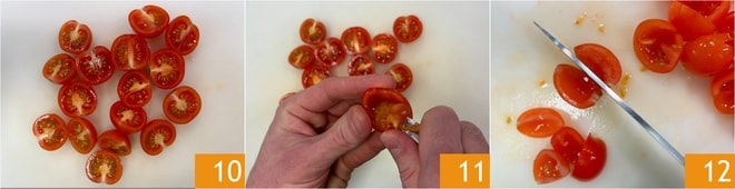 Lave os tomatinhos e corte-os ao meio 10, remova as sementes e a polpa 11, depois corte-os em gomos 12.