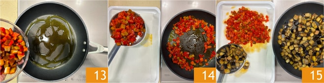 Em uma frigideira despeje o óleo e adicione os pimentões 13, cozinhe por 10 minutos e depois coloque-os sobre papel toalha 14. Coloque na frigideira as berinjelas, frite aos poucos, em fogo alto, mexendo pouco, até formar uma crosta crocante, depois coloque-as sobre papel toalha 15.