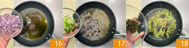 Em uma frigideira despeje o óleo, adicione as cebolas 16, o aipo 17 e deixe refogar por alguns minutos. Junte as alcaparras bem espremidas 18.