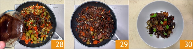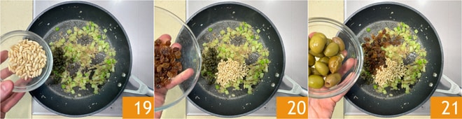 Adicione também os pinhões 19, mexa para tostá-los. Em seguida, adicione as passas 20 e as azeitonas 21. Mexa e deixe cozinhar por alguns minutos.