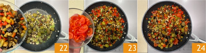 Apague o fogo e adicione na frigideira as berinjelas, os pimentões 22 e os tomatinhos 23. Ajuste o sal e a pimenta, mexa para dar sabor e integrar os ingredientes 24.