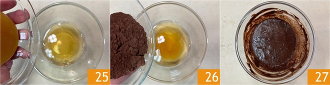 Em uma tigela, despeje o vinagre de vinho branco, adicione o mel de flor de laranjeira 25 e o cacau amargo 26. Mexa até obter uma mistura homogênea 27.