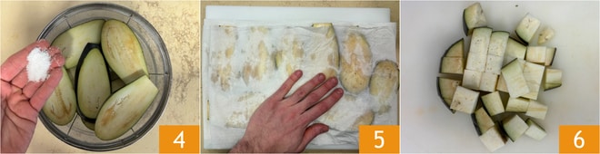 Coloque as fatias de berinjela sob sal 4 por 30 minutos. Depois enxugue-as com papel toalha 5 e corte-as em cubos 6.