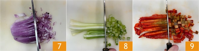Descasque a cebola e pique-a com uma faca 7. Lave o aipo e corte-o em cubos 8. Limpe um pimentão, removendo o talo e as sementes internas, lave-o e corte-o em tiras e depois em cubos 9.