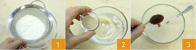 Para preparar os caracóis de pão recheados com presunto e fontina, comece pelo preparo da massa de pão: em uma tigela peneire a farinha 1, em outra tigela dissolva o fermento desidratado na água morna 2 mexendo com uma colher, incorpore depois o malte (como alternativa você pode usar o açúcar) 3 até obter uma mistura homogênea.