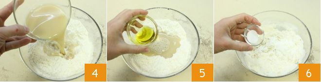 Despeje a mistura na tigela com a farinha 4, adicione o azeite de oliva 5 e o sal 6.