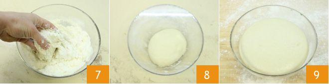 Misture os ingredientes com as mãos 7 e transfira a massa para uma superfície e amasse até obter uma massa lisa, transfira a massa para uma tigela, cubra com filme plástico 8 e deixe-a no forno desligado com a luz acesa para crescer por 2 horas. Depois do tempo de crescimento, a massa terá dobrado de volume 9,