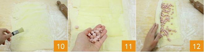transfira-a para a superfície e abra uma folha de 25x35 cm, pincele a superfície com uma mistura de ovo batido com uma colher de leite 10. Passe agora para o recheio: disponha sobre a superfície da folha de pão as fatias de fontina deixando 2 cm de borda para facilitar o enrolamento. Distribua os cubos de presunto 11. Agora enrole a massa pelo lado mais comprido 12,