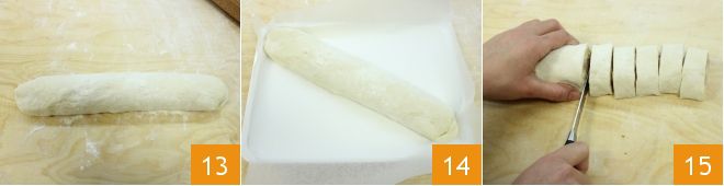 uma vez enrolado o rolo 13, transfira-o para uma bandeja coberta com papel manteiga 14 e deixe descansar na geladeira por pelo menos meia hora. Após esse tempo, corte o rolo em fatias de 2,5 cm 15, você obterá cerca de 12 caracóis, transfira-os para uma assadeira coberta com papel manteiga, deixe os caracóis crescerem por pelo menos 1 hora no forno desligado com a luz acesa.