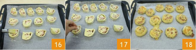 Pincele a superfície dos caracóis com a emulsão de leite e ovo batido 16, polvilhe com as sementes de papoula 17 e asse no forno estático pré-aquecido a 180°C por 25 minutos (ou no forno ventilado a 160°C por 15-20 minutos) até que fiquem dourados. Seus caracóis de pão recheados com presunto e fontina estão prontos 18 para serem servidos!