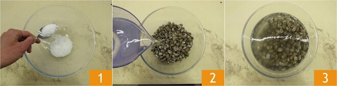 Para preparar os caracóis do mar ensopados, a primeira coisa a fazer é purgá-los. Em uma tigela grande, coloque 150 g de sal 1, adicione os caracóis e cubra com um litro de água 2. Deixe descansar por cerca de uma hora 3.