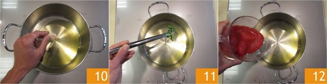 Enquanto isso, comece a preparar o molho para os caracóis. Em uma panela, coloque um fio de azeite, adicione o manjericão e o dente de alho 10, deixe dourar por alguns minutos, até que os aromas sejam liberados. Retire o alho e o manjericão com uma pinça 11 e adicione os tomates pelados 12.