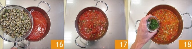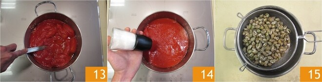 Amasse com um garfo grande para quebrar os tomates grosseiramente 13 e ajuste o sal 14. Após os 15 minutos de cozimento, escorra os caracóis 15.