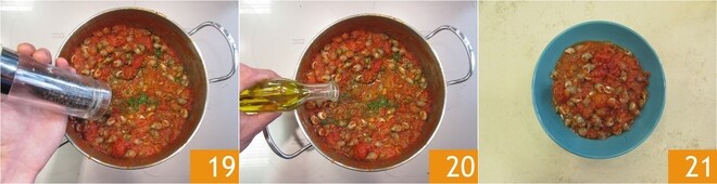 Adicione uma pitada de pimenta 19, um fio de azeite cru 20, misture bem e sirva os caracóis do mar ensopados bem quentes 21.
