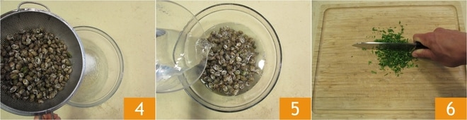 Neste ponto, escorra-os e repita a mesma operação. Transfira-os para a tigela com 150 g de sal 4, cubra com um litro de água 5 e espere mais uma hora. Repita esta operação mais uma vez. Se a água ainda estiver suja, você pode repetir essa operação para remover todas as impurezas. Quando os caracóis estiverem bem purgados, pique a salsa 6 e reserve.