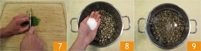 Faça o mesmo com o funcho 7. Em seguida, passe para o cozimento dos caracóis. Escorra-os e transfira-os para uma panela grande. Adicione 40 g de sal 8 e cubra com água fria 9. Leve à fervura e deixe cozinhar por 15 minutos.