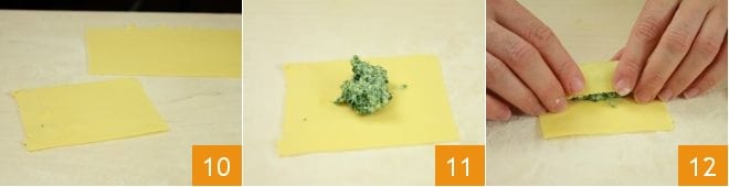 Abra a massa de ovo em uma folha muito fina, que você cortará em retângulos de 10x8 cm 10. No centro de cada retângulo de massa, coloque uma colher de chá rasa de recheio 11 e enrole a folha sobre si mesma pelo lado mais longo 12.