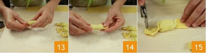 Agora modele suas balas: gire no sentido horário a aba direita 13 e no sentido anti-horário a esquerda, como para fechar o papel de uma bala 14. Corte as bordas externas de ambas as abas com uma roda dentada 15.
