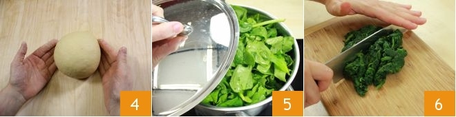 Uma vez pronta, dê-lhe uma forma esférica 4, envolva com filme plástico e deixe descansar em local fresco com luz acesa por cerca de 30 minutos. Dedique-se à preparação do recheio: cozinhe o espinafre em pouquíssima água salgada 5 ou cozinhe-o no vapor ou simplesmente salteie em fogo baixo em uma frigideira antiaderente. Depois, esprema e pique finamente 6. Uma vez cozido e bem espremido, o espinafre pesará cerca de 100 gr.