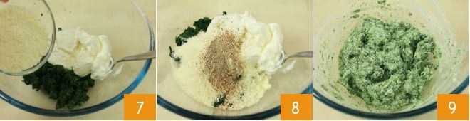 Coloque o espinafre picado em uma tigela onde você adicionará a ricota e o Grana Padano DOP ralado 7, a noz-moscada, o sal e a pimenta 8. Misture todos os ingredientes até obter um composto macio, mas compacto 9.