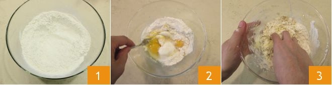 Para preparar as balas de ricota e espinafre, comece pela Massa fresca de ovo (massa e formatos). Em uma tigela, coloque a farinha, reservando cerca de 50 g para adicionar se necessário 1; depois adicione os ovos 2 e misture tudo na mesma tigela 3. Quando os ovos forem absorvidos, pode prosseguir em uma superfície de trabalho e amasse até que a massa fique lisa e elástica.