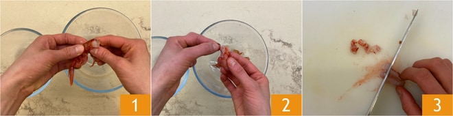 Para preparar a carbonara de mar com camarões, a primeira coisa a fazer é Como limpar os camarões. Retire as cabeças 1 e reserve. Retire o intestino 2 e a carapaça. Corte a carne em pequenos cubos 3.