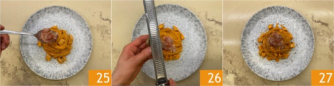 Emprate e complete com o tartare de camarões 25 e uma pitada de bottarga 26. Sua carbonara de mar com camarões está pronta para ser saboreada 27.