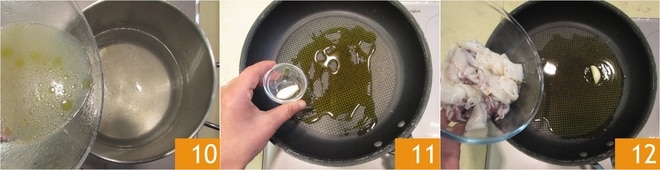 Coloque uma panela com água no fogo para cozinhar a pasta e adicione quase todo o líquido dos moluscos 10, reservando um pouco. Em outra frigideira, aqueça um fio de azeite com um dente de alho 11, depois adicione as lulas 12.