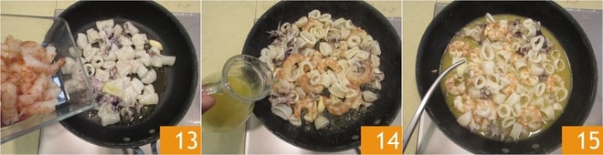 Adicione também os camarões 13 e refogue por 3-4 minutos, depois adicione o líquido reservado 14 e retire o alho 15.