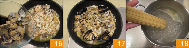 Adicione os mexilhões e as amêijoas na frigideira com as lulas e os camarões 16, misture e desligue o fogo 17. Enquanto isso, a água já deve estar fervendo, então adicione sal moderadamente e cozinhe os spaghetti 18.