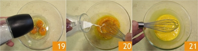 Enquanto isso, prepare o creme de ovos: coloque os ovos inteiros e a gema em uma tigela, adicione sal 19, pimenta e o creme de leite 20, depois misture bem com um batedor para obter uma mistura homogênea 21.