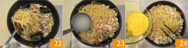 Escorra os spaghetti diretamente na frigideira 22, adicione uma concha da água de cozimento da pasta 23 e misture brevemente. Neste ponto, desligue o fogo e adicione o creme de ovos, misturando rapidamente para evitar que coagule 24.