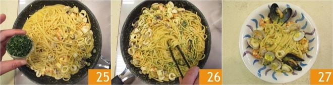 Perfume com a salsinha picada 25 e misture novamente 26. Sirva imediatamente sua carbonara de mar viareggina 27!