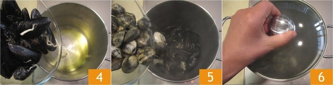 Em uma panela, aqueça um fio de azeite com um dente de alho, depois adicione os mexilhões 4 e as amêijoas 5, tampe 6 e deixe em fogo alto por alguns minutos.